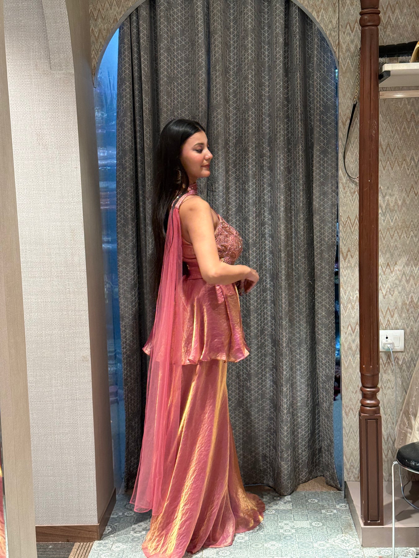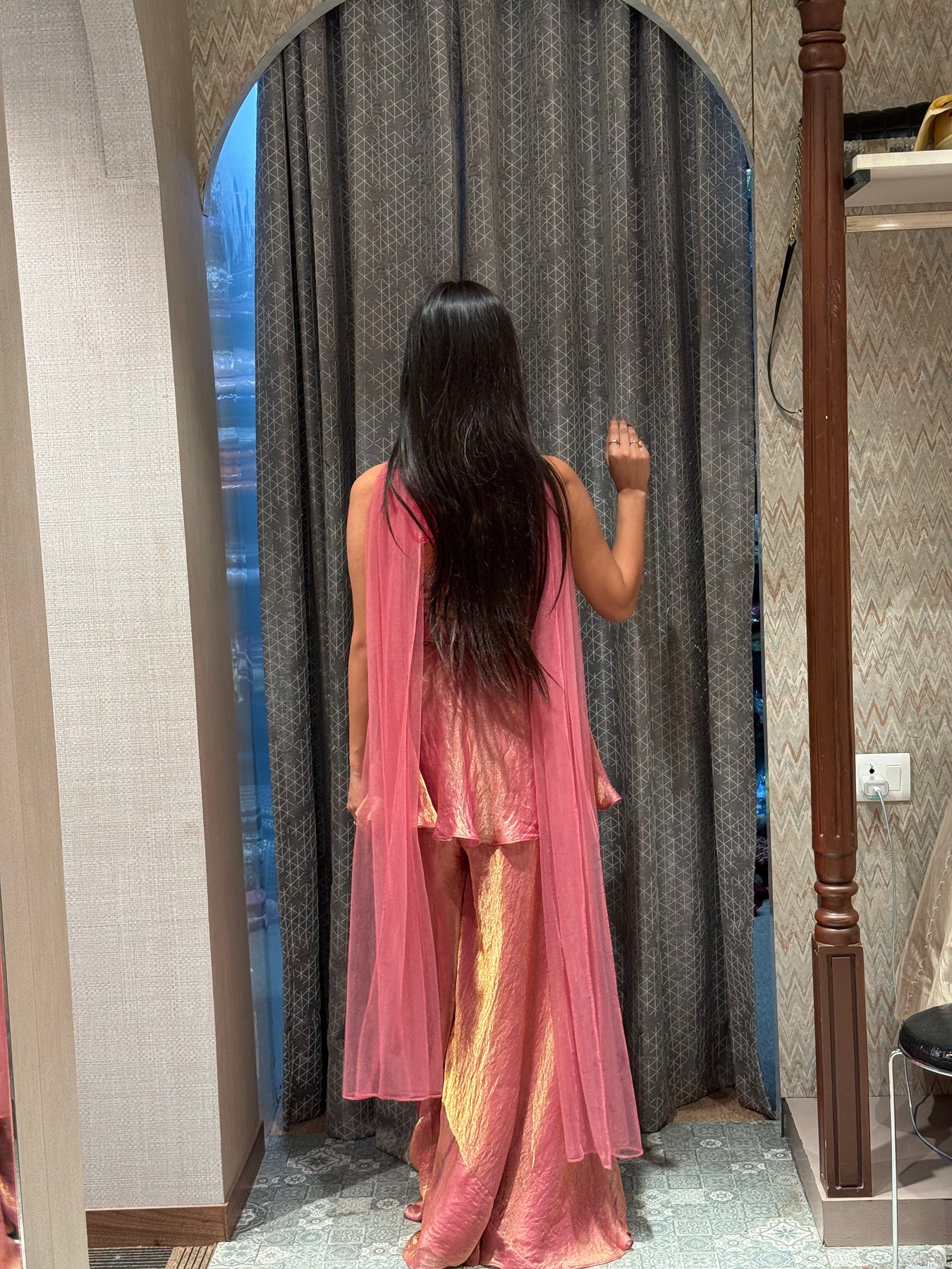 The ensemble is a three-piece set composed of a peplum-style short kurti, wide-leg flared trousers, and a coordinating dupatta. The dominant color is a rich, shimmering Rust Pink , enhanced by a metallic finish that catches the light.