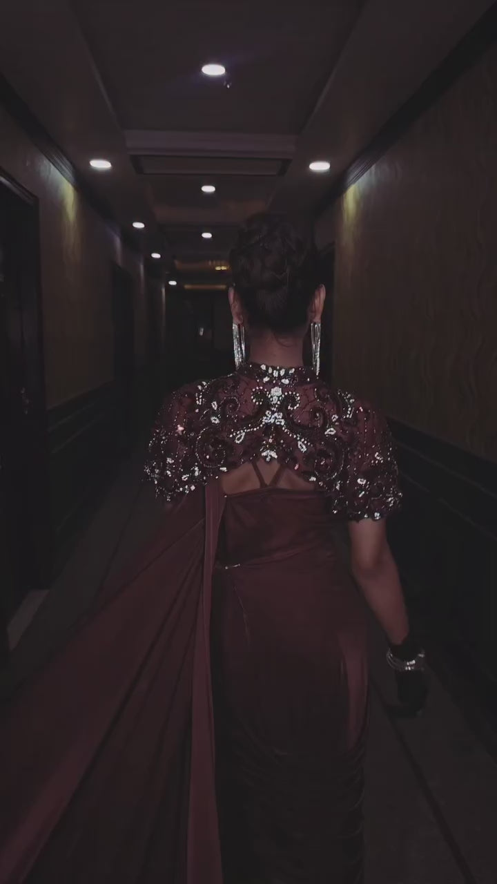 This dress is a stunning example of contemporary fusion, combining the grace of a traditional drape with the edgy sophistication of a modern evening gown. Its deep color and intricate metallic accents make it an ideal choice for high-end cocktail parties, red-carpet events, or reception evenings.