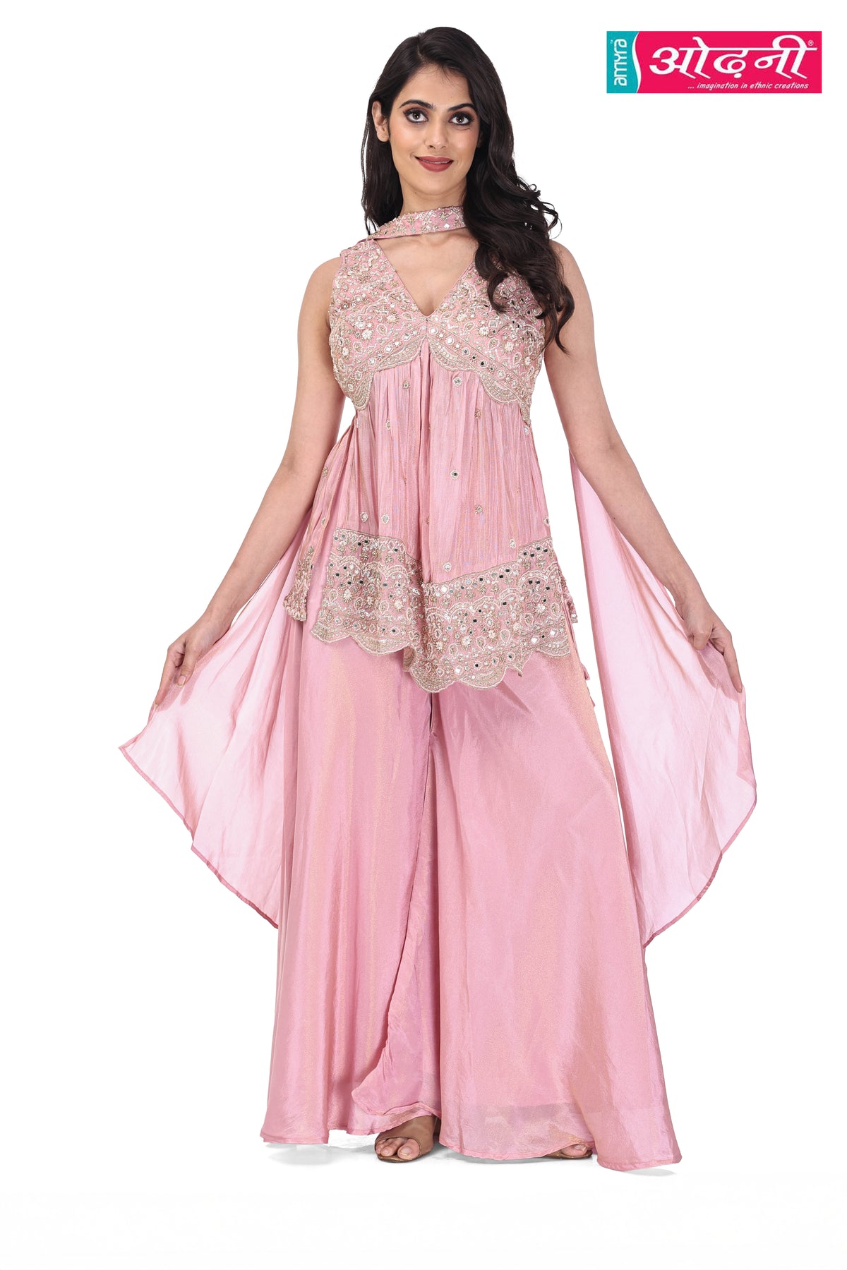 This baby pink ensemble from the Amyra by Odhni collection features a soft, shimmering aesthetic with intricate hand-crafted details.