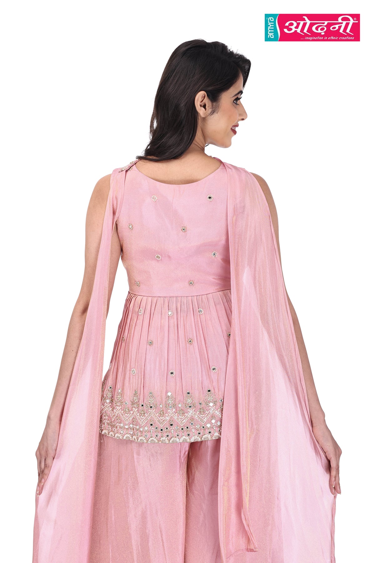• Style: A matching pink sheer dupatta is attached or draped at the back, adding to the ethereal movement of the outfit.