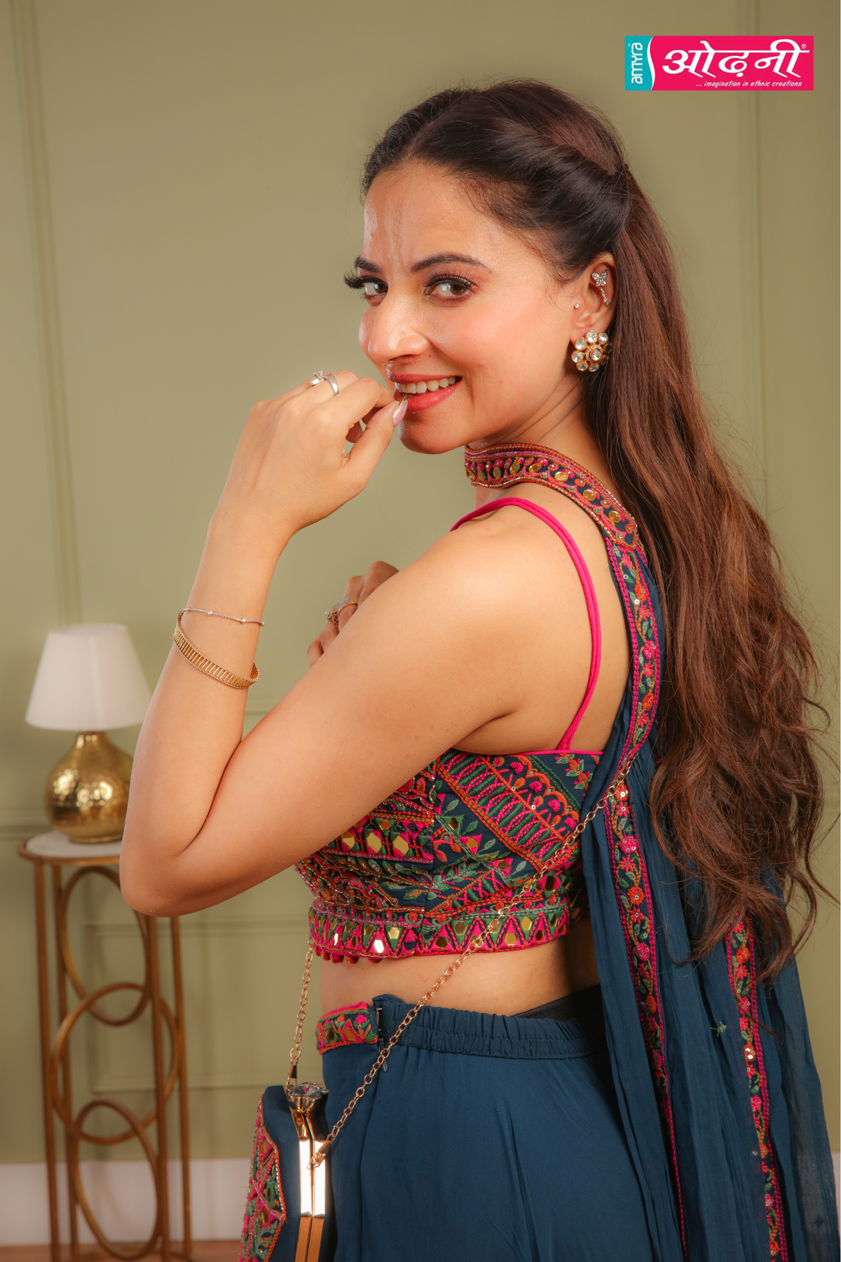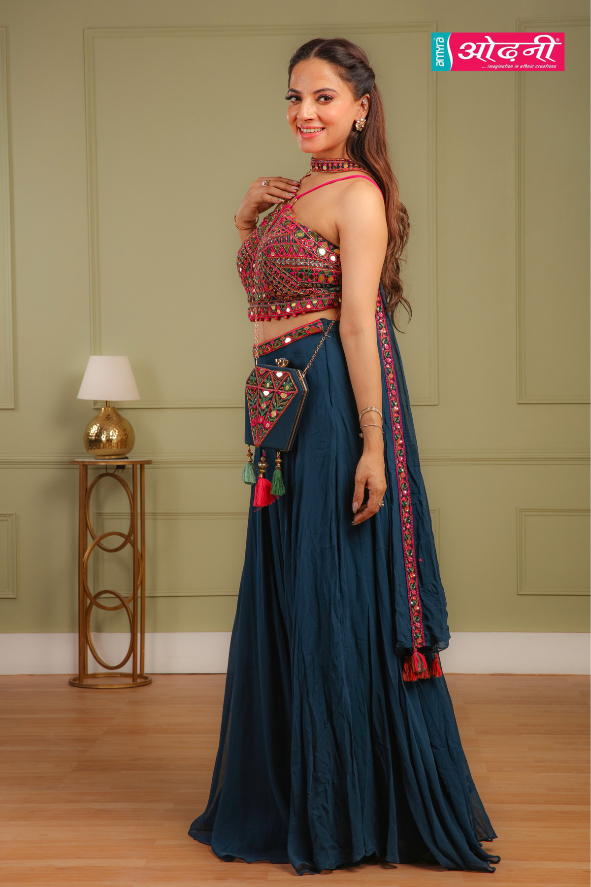 This vibrant and chic ensemble is a contemporary interpretation of Indian festive wear, featuring a flowing Deep Navy palazzo paired with a heavily embellished Multicolour Mirror Work crop top. It offers a perfect blend of comfort and high-fashion drama, making it an excellent choice for Mehendi, Sangeet, or destination wedding events.