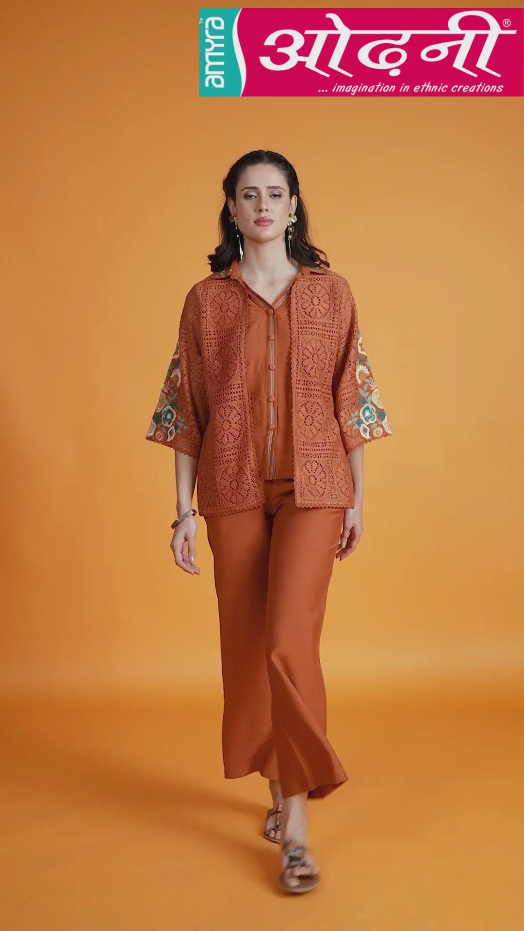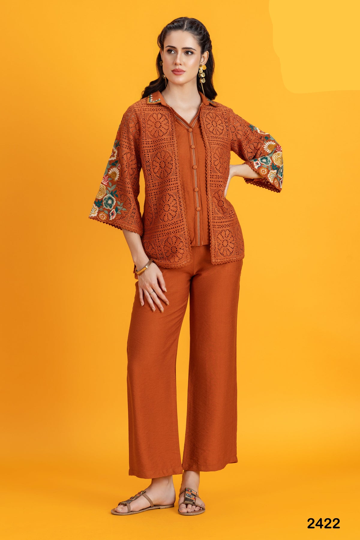 That is a rich, earthy, and intricately crafted cord set, defined by its warm color and beautiful cutwork/crochet jacket with vibrant embroidery.