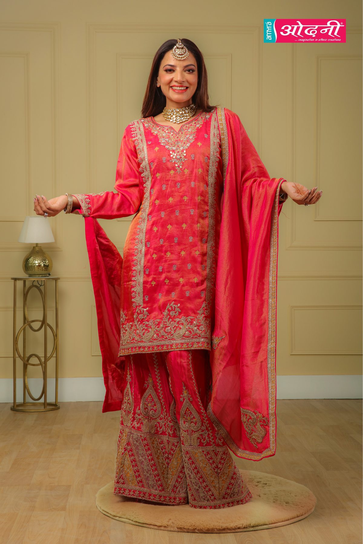 Kurta (Top): A knee-length, straight-cut tunic designed for elegant fitting. A luxurious fabric like Raw Silk in a brilliant Fuchsia Pink, possessing a deep, festive sheen.