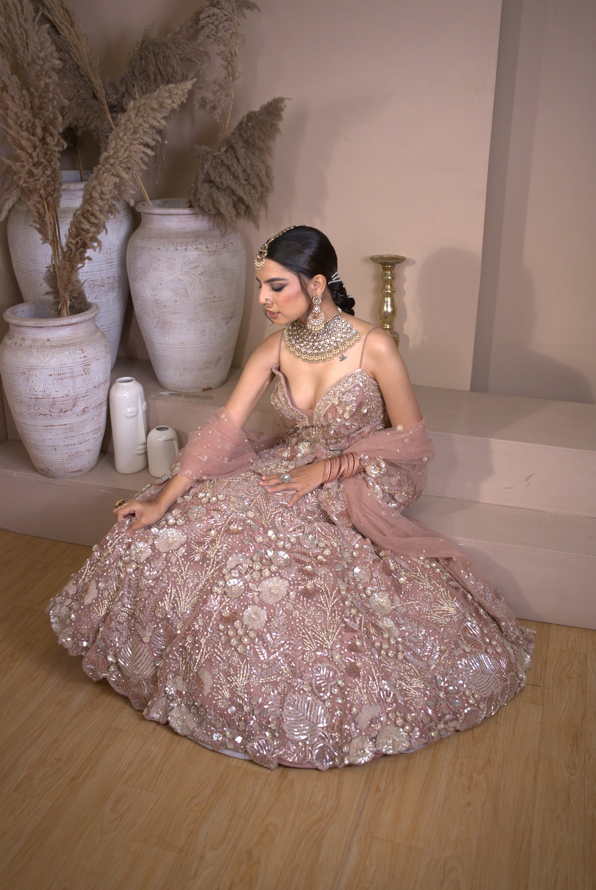 This opulent lehenga set is a masterpiece of traditional craftsmanship, featuring dense, high-relief embellishments that create a shimmering, multidimensional effect. The soft rose-gold or blush-pink palette serves as an elegant canvas for the "extreme heavy" silver and pearl handwork.