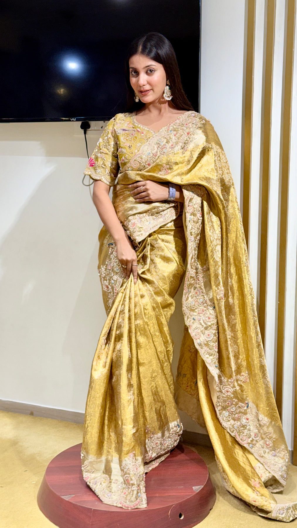 Blouse: The accompanying short-sleeved blouse is crafted from a coordinating Gold fabric. The front and sleeves are fully covered in intricate threadwork and delicate beadwork in pastel shades of pink, yellow, and green, ensuring the top is just as richly detailed as the saree itself.