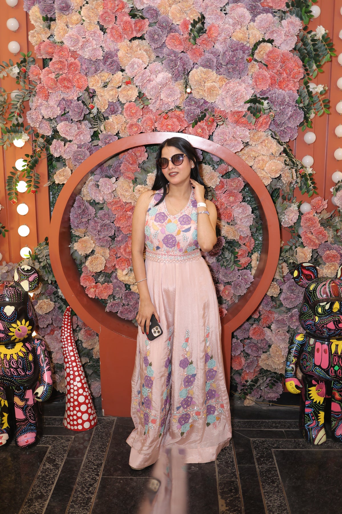 This beautiful outfit is a flowing dress featuring a soft pastel color and vibrant, nature-inspired embroidery, ideal for an elegant daytime event.