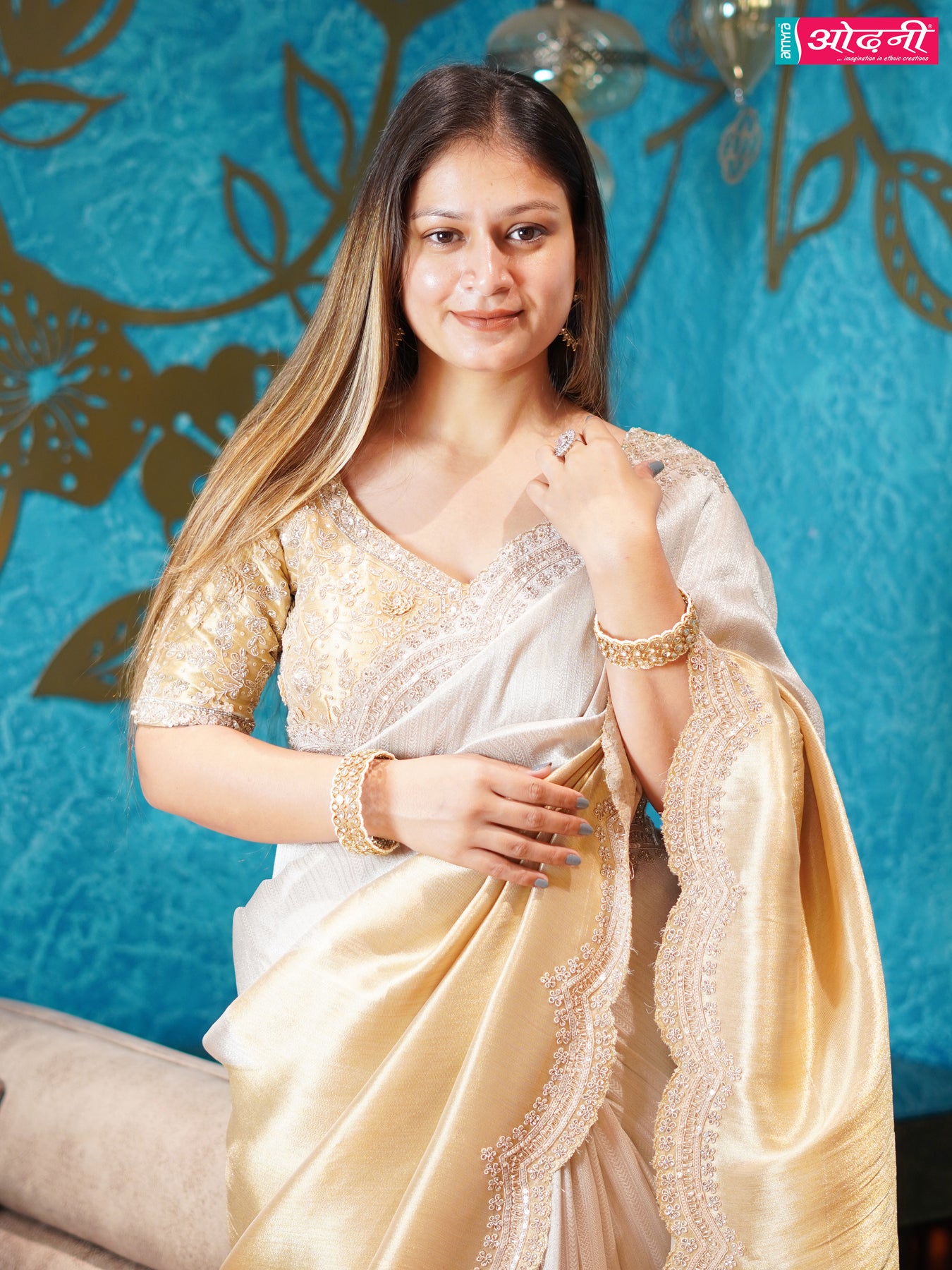 The ensemble is a traditional saree set consisting of the nine-yard drape and a matching blouse, featuring a striking blend of Cream and Luminous Champagne Gold hues.