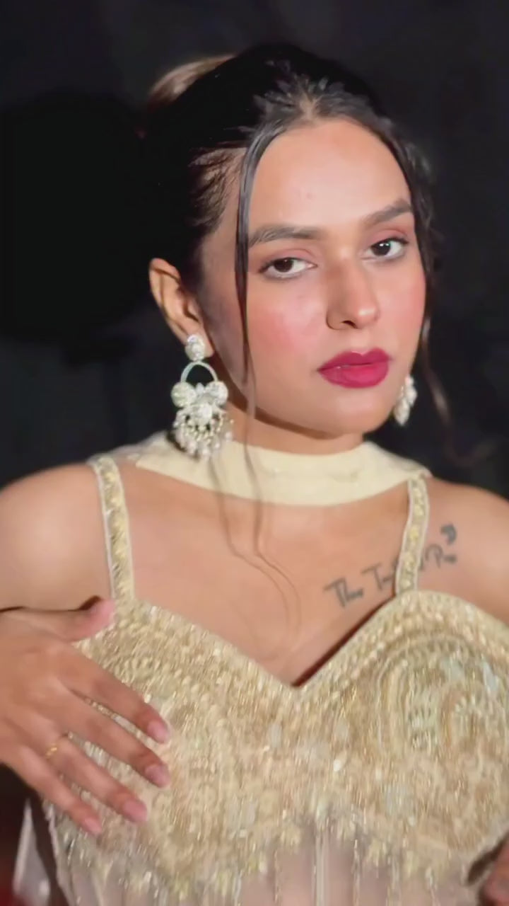 This magnificent set features a muted, sophisticated Cream colour, heavily detailed with ornate beadwork and Zari, giving it a luxurious, ethereal glow. It is designed with a modern, structured corset blouse and a free-flowing skirt. The ensemble consists of a flowing skirt (lehenga), a structured, heavily...Regular price ₹ 32,685.00Regular priceUnit price per