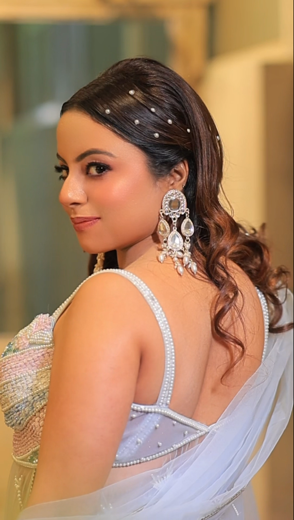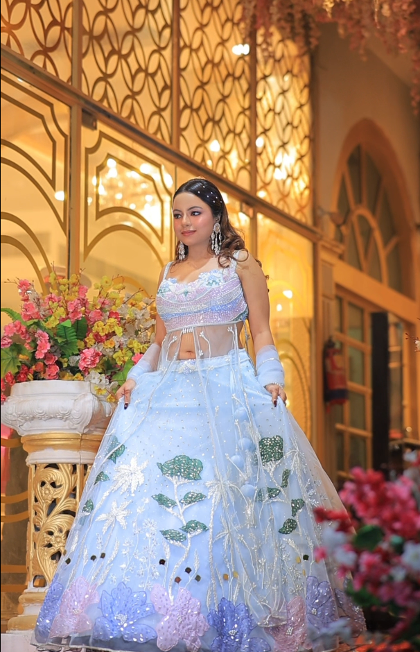 This ethereal sky-blue lehenga set is a whimsical blend of floral artistry and modern design, featuring three distinct pieces that create a dreamlike silhouette.