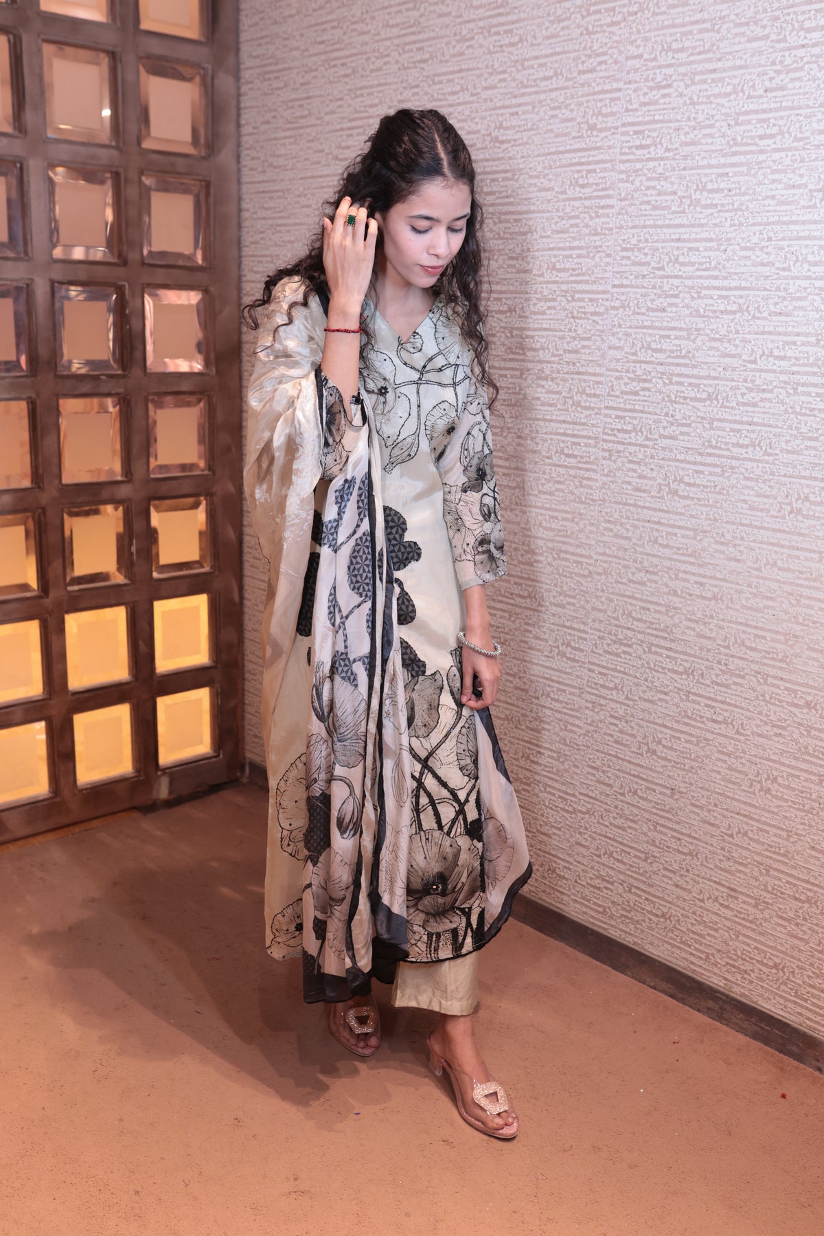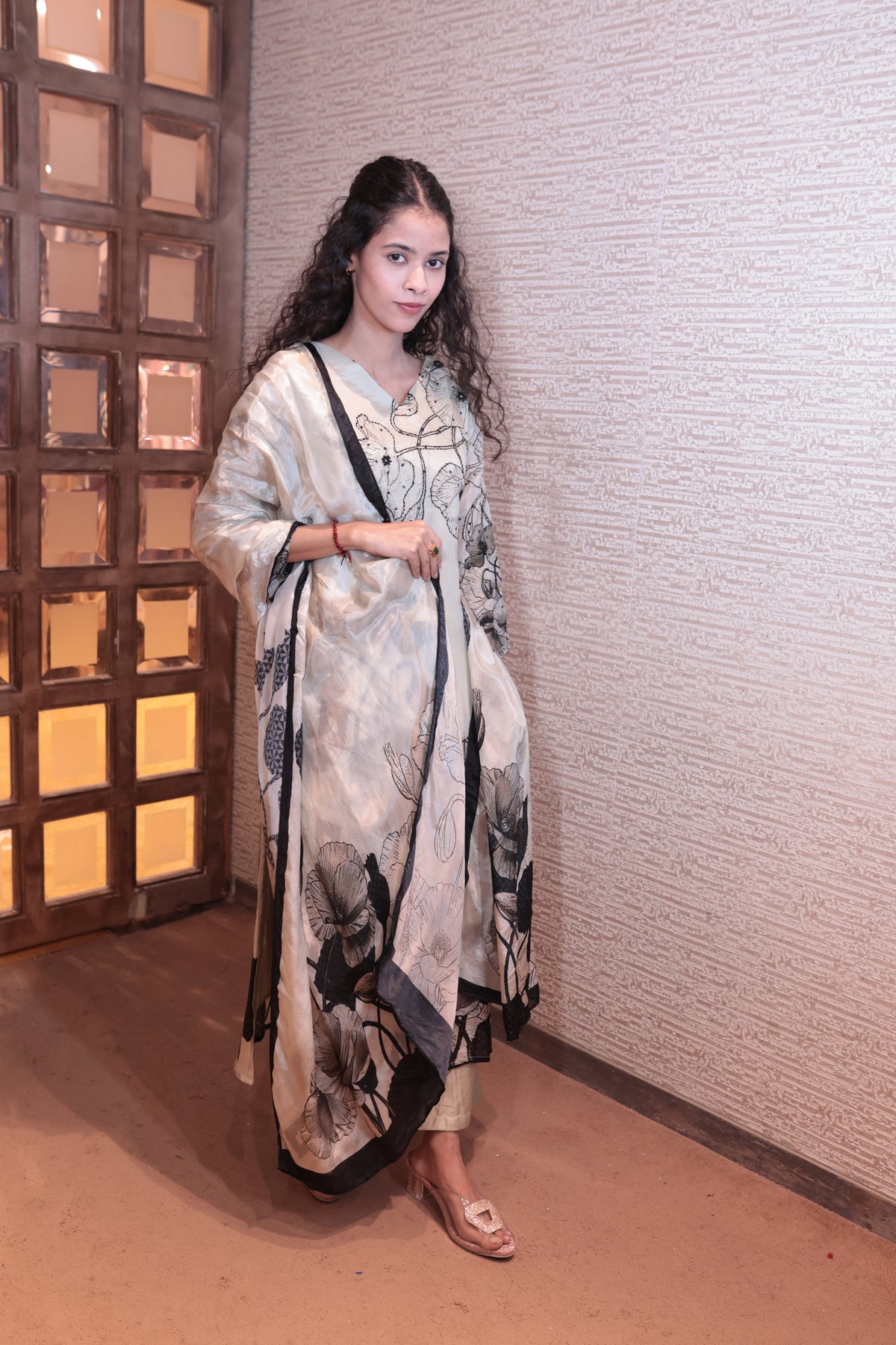 Color Palette: Soft Ivory base with striking Black and Grey floral and leaf print/hand-painting. Contemporary Ethnic Wear (Printed Organza Kurta, Trousers, and Dupatta Set).