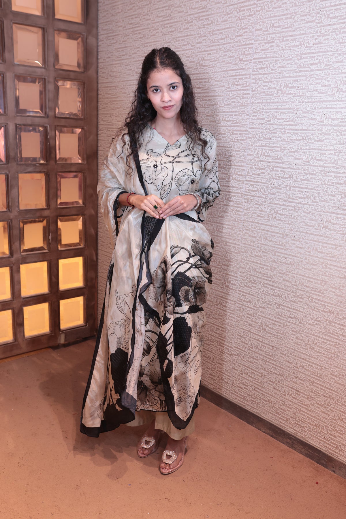 • Artistic Print: The Kurta features large, stylized Black and Grey floral motifs (like poppies or lilies) that appear to be hand-painted or digitally printed onto the fabric. These motifs are concentrated along the edges and hems, with the lighter background visible in the center.