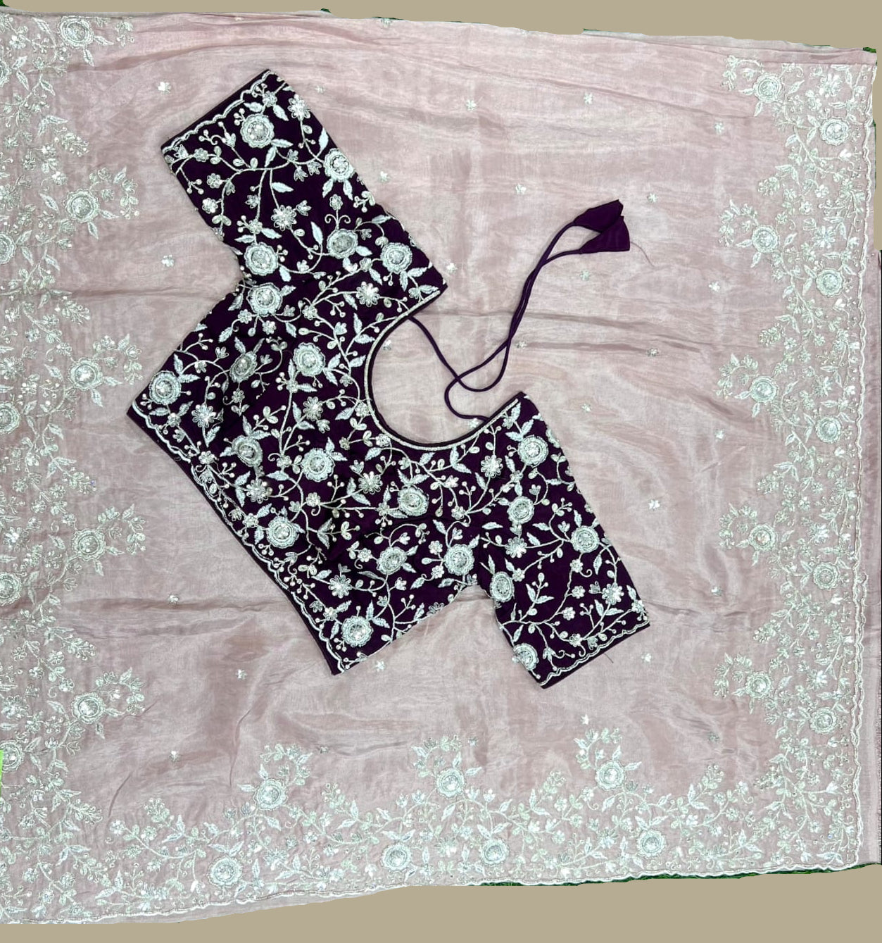 Blouse: This ensemble comes with the stitched blouse as shown, featuring a deep plum heavily adorned with silver zardosi-style floral embroidery and a classic round neckline.