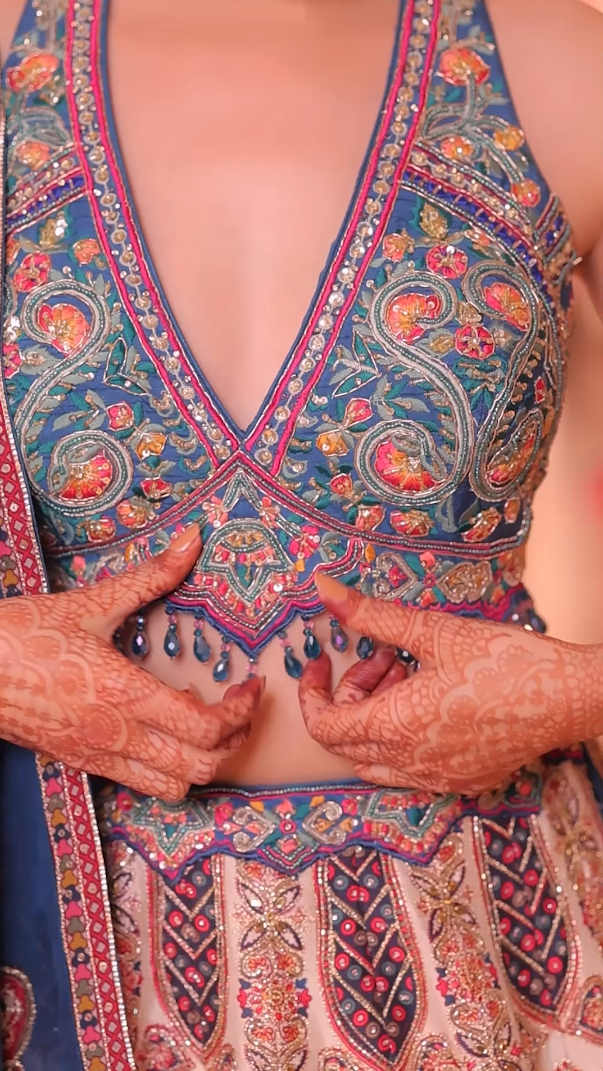 • The waistline of the choli is finished with a unique scalloped edge and delicate beaded hangings for added texture.