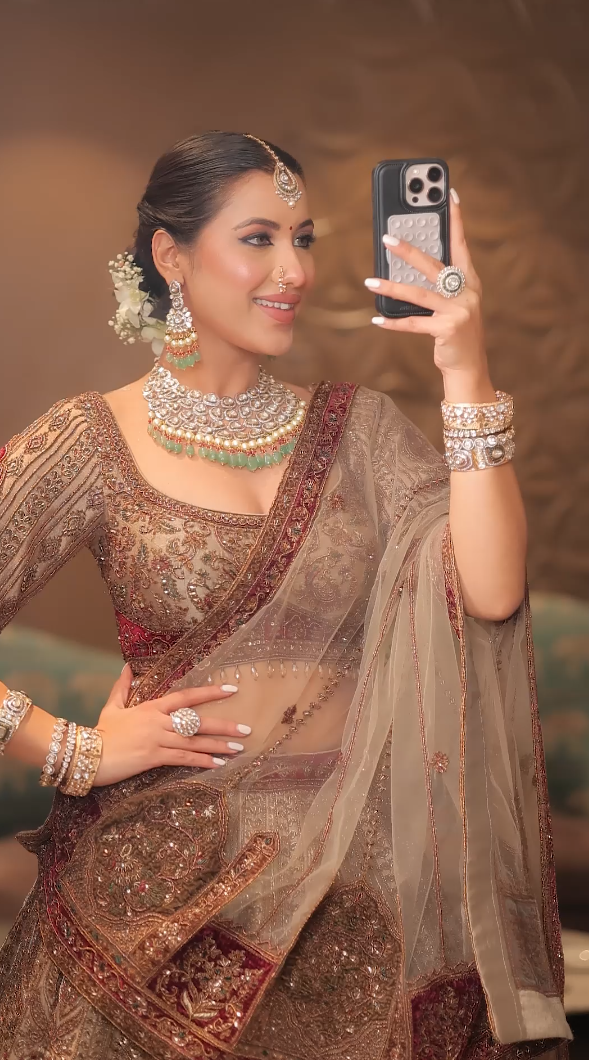 This ensemble is the pinnacle of bridal wear, perfect for a wedding ceremony, reception, or a high-end royal event.