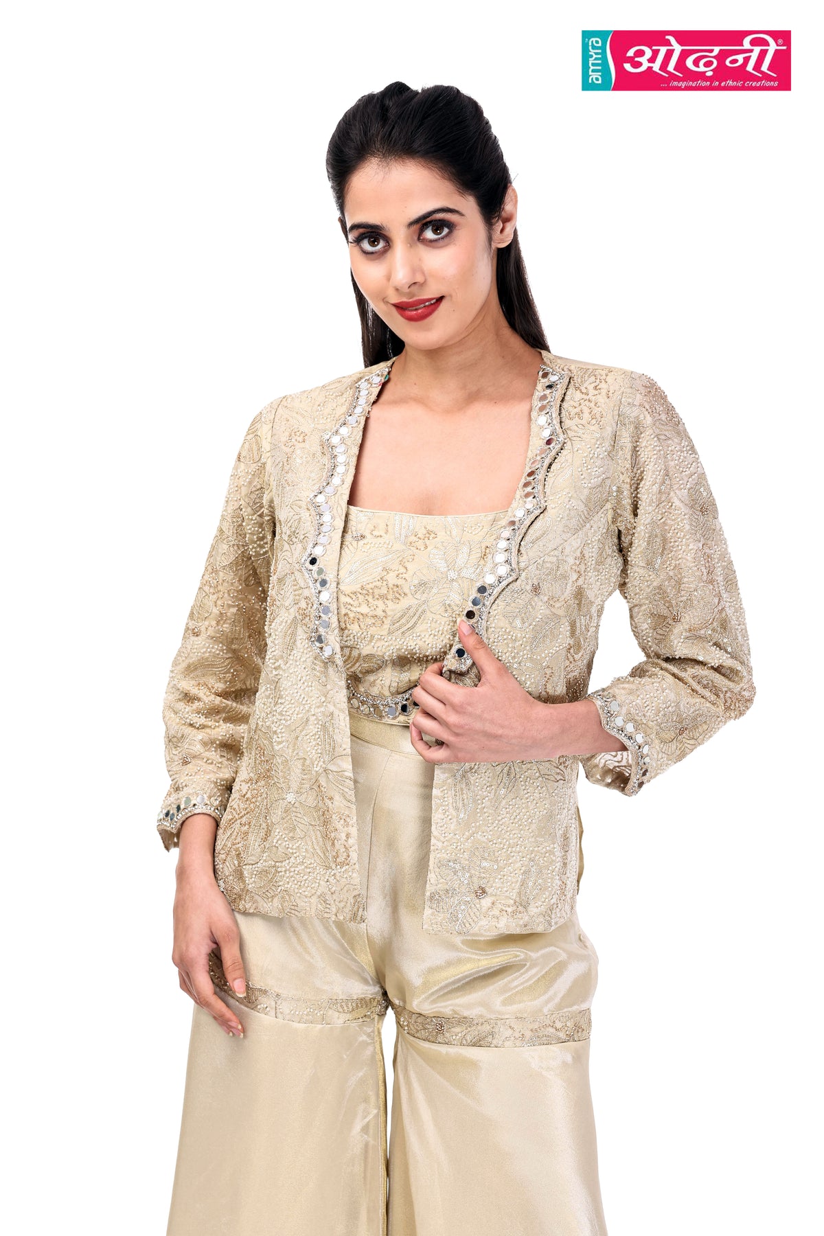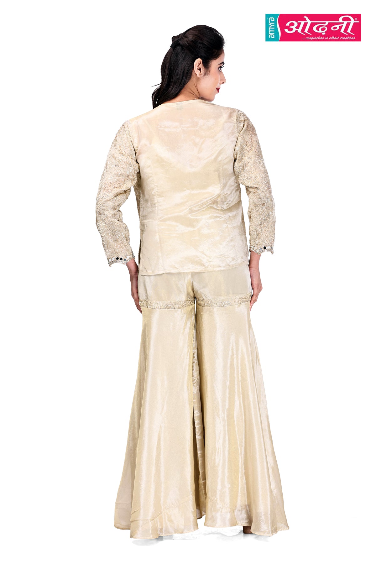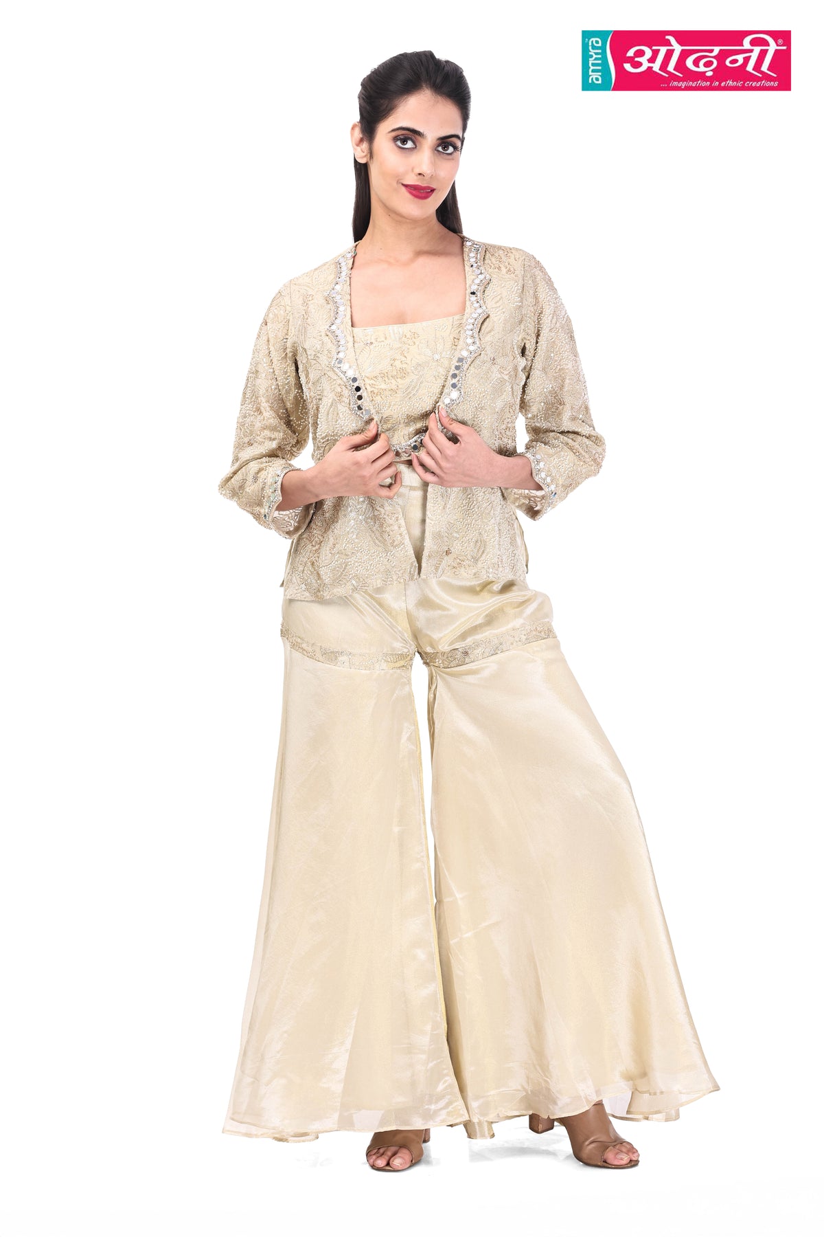 • Bottoms: The palazzos feature a structured waist with a subtle embroidered band, flowing into a dramatic, wide-leg flare that mimics the grace of a lehenga with the ease of trousers.