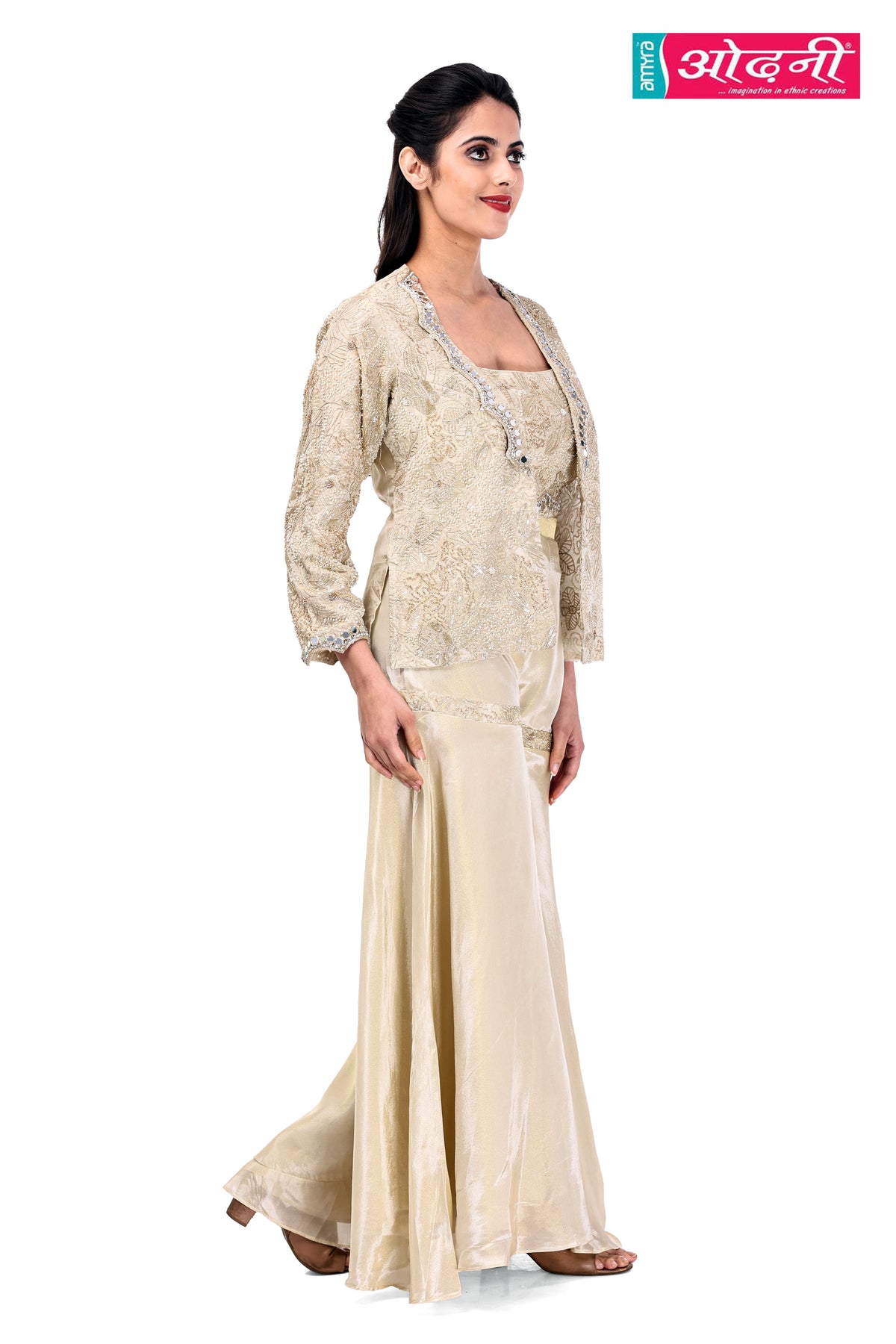 This contemporary fusion ensemble offers a sophisticated take on Indo-Western festive wear, perfect for a bridesmaid, a sangeet ceremony, or an upscale evening celebration.