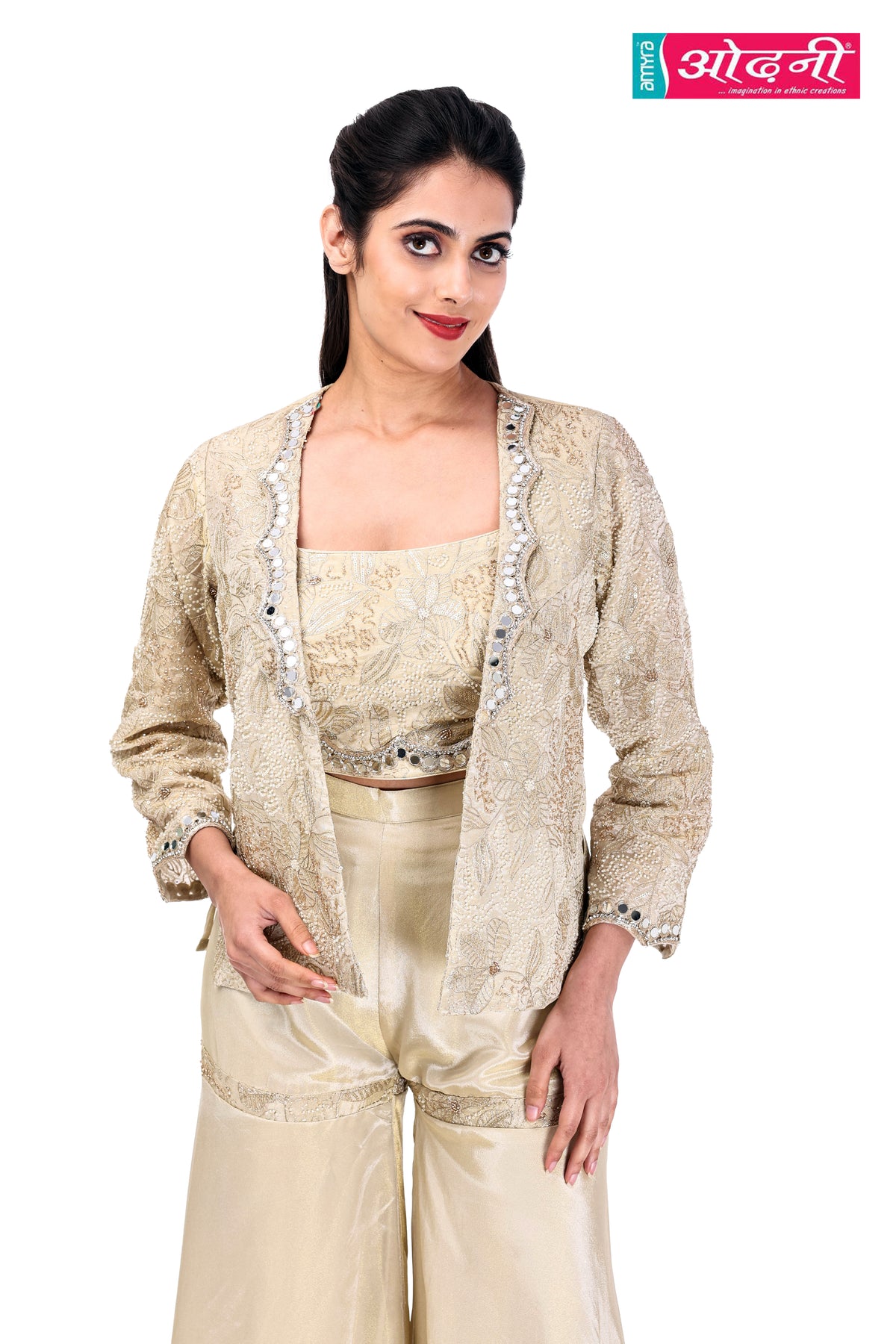 • The Silhouette: A chic, high-fashion co-ord set featuring wide-leg Palazzo pants paired with a structured crop top and a matching open-front jacket.