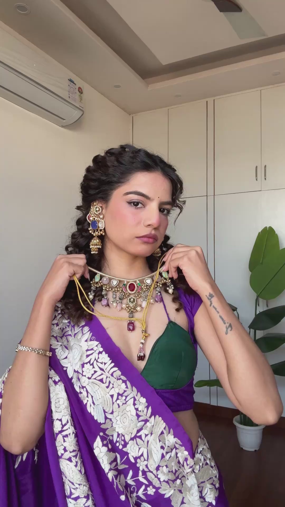 - Earrings: Complemented by oversized golden Jhumkas with pearl drops, bridging the gap between the modern blouse and traditional saree craft.
