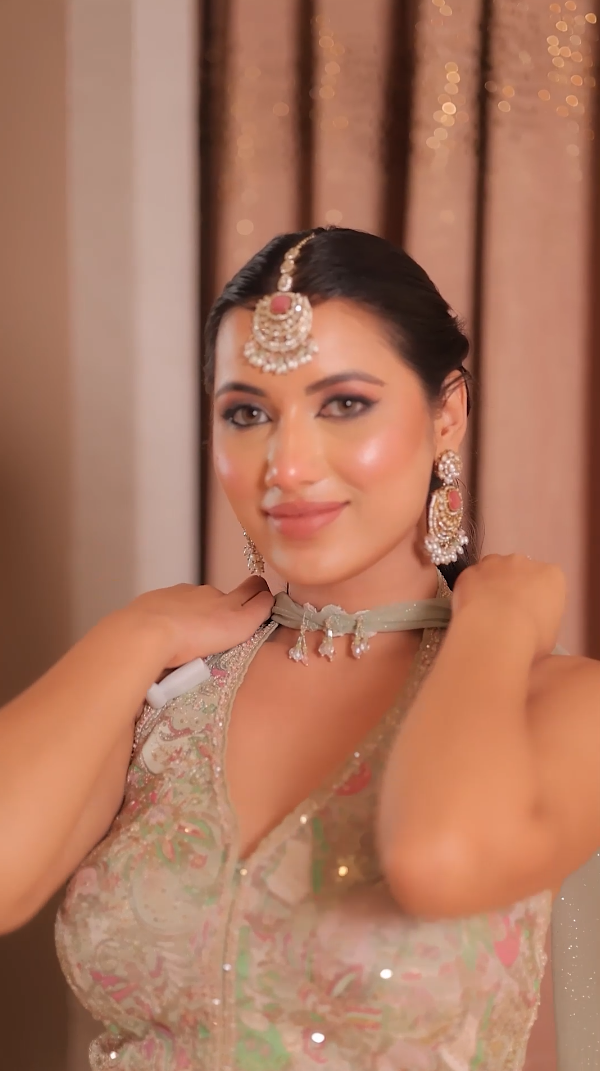 Neckline: Designed with a glamorous halter-style V-neckline that accentuates the shoulders and adds a touch of modern allure.