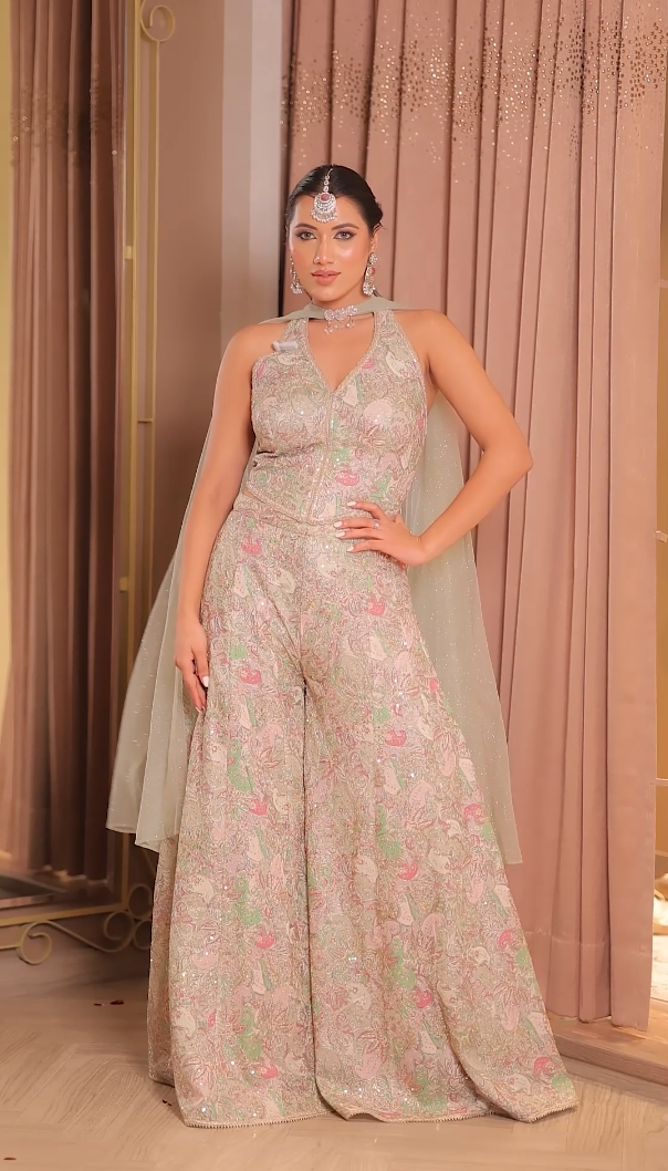 This ensemble is a high-fashion take on the modern fusion jumpsuit, blending traditional intricate embroidery with a sleek, Western-style silhouette. It is a perfect statement piece for contemporary celebrations like a cocktail party, Sangeet, or an upscale festive dinner.